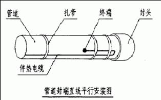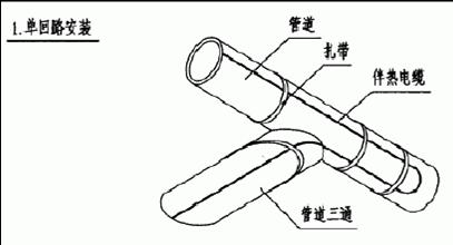 4)直線平行安裝時,伴熱電纜應(yīng)沿彎頭凸面安裝,并在彎頭的兩端及中間作固定 |