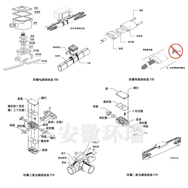 首端連接:電源接線盒,電源電纜鋪設到電伴熱現場后,通過電源接線盒與電伴熱帶連接。電源接線盒適用于危險區域。 安裝時,注意接線盒頂部電纜入口處的密封,以避免雨水進入。