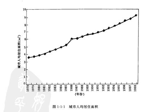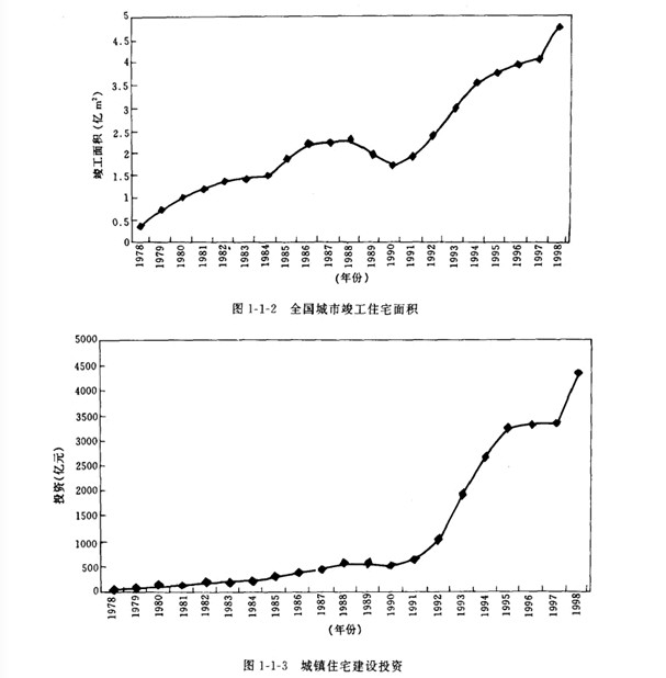 我國(guó)地域廣闊.人口眾多.房屋建筑規(guī)模巨大。其中住宅建設(shè)約占居住建筑的92%.而住宅,是世界各國(guó)都面臨的社會(huì)問題。“人人享有適當(dāng)?shù)淖》?rdquo;已成為聯(lián)合國(guó)第二次人居大會(huì)所提出的戰(zhàn)略目標(biāo)。改革開放以來.從1979年到1998年底.我國(guó)城鄉(xiāng)新建住宅建筑面積158億 ㎡其中城鎮(zhèn)住宅宅 約35億 ㎡.農(nóng)村作宅約123億MI.全國(guó)城市人均居住面積從3. 6 ㎡增加到9.3 ㎡(圖一1一1).竣 工面積從3 752萬 ㎡增加到47 600萬 ㎡(圖1-1-2).城鎮(zhèn)住宅建設(shè)投資從39.21億元增加到4 310.81億元(圖1-1 3). 1.7億戶遷入新居."八五"期間共完成城市住宅建設(shè)投資8 543億元.竣工 住宅10.5億 ㎡,僅1995年住宅竣工面積3.3億 ㎡.比“七五”期間增長(zhǎng)76%.九五.期間計(jì)劃建設(shè) 住宅12億 ㎡,比“八五”期間增長(zhǎng)14.3%.到1999年底。我國(guó)設(shè)城市加為668個(gè).當(dāng)年全國(guó)城市新 建房屋竣工面積4.362 5億㎡.其中住宅2.971 6億㎡.當(dāng)年底.全國(guó)住宅總使用面積為30.505 2億 ㎡.總居住面積為21.011 2億㎡.人均使用面積達(dá)到14.2 ㎡.人均居住面積達(dá)到9. 8 ㎡分別比上 年增長(zhǎng)0.6和0. 5 ㎡.居民生活條件大有改善。住宅建設(shè)量大面廣.至今仍呈上升趨勢(shì).而且這個(gè) 上升趨勢(shì)還將持續(xù)20-30年。由此看出,我國(guó)住宅建設(shè)正處于快速發(fā)展階段.不僅是中國(guó)歷史上的 最高峰.也是世界上任何一個(gè)國(guó)家所不可比擬的。