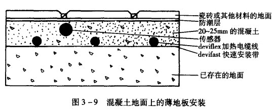 該系統(tǒng)是由可加熱柔韌電纜和感應(yīng)器、恒溫器等構(gòu)成,可劃分為兩類:一種是加熱電纜線,可廣泛應(yīng)用于各種安裝區(qū)域;另一種是加熱席墊,用于薄地板、翻新后的地板。該供熱方式適用于任何材質(zhì)的地面(見圖3一9、圖3一10),如木地板、大理石、瓷磚等。