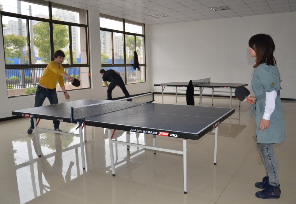 外賓與美麗翻譯小姐切磋乒乓球藝